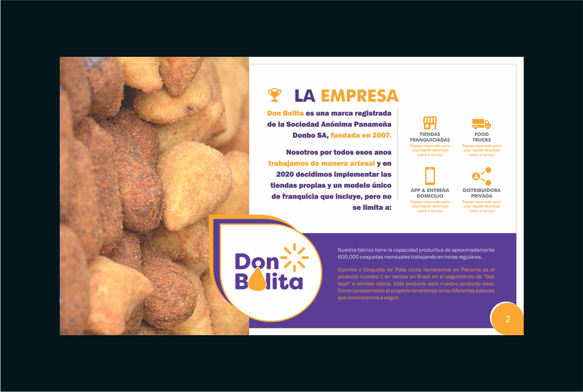 Don Bolita é uma marca registrada fundada no Panamá em 2007. Trabalhando na área de alimentos de forma artesanal ao longo da última década, tornou-se, em 2020, um modelo de franquia, food-trucks, distribuidora privada e entrega através de aplicativos.