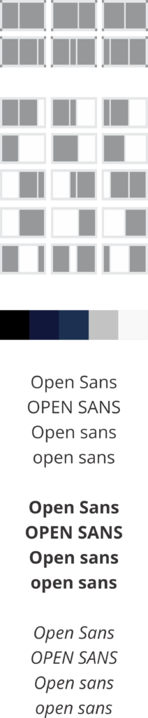 Tomando como ponto inicial a identidade visual, criou-se algumas estruturas de grids para dispor o conteúdo. Como, nesta etapa, apenas parte dos textos estavam prontos, alguns testes foram realizados com conteúdo genérico e as imagens ilustrativas e os ícones foram selecionados. Por fim, adicionou-se os textos oficiais e trabalhou-se nas harmonização das cores e na tipografia.